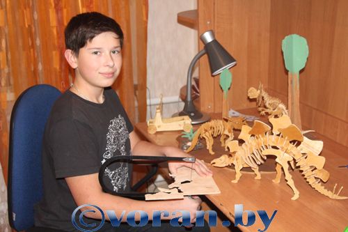 Эдвард Стефанович учится в 8 классе Вороновской школы. Уже давно мальчик увлекается историей, а самую большую слабость питает к динозаврам. Он знает об этих древних ящерах практически все. В детстве он их рисовал, потом начал лепить из пластилина, причем соблюдая мельчайшие детали. Уже в пятом классе Эдвард на уроках труда увлекся резьбой по дереву, его поддержал учитель В.И. Станевич. Первой работой из фанеры стала стреляющая катапульта, потом он решил вырезать динозавра. Нашел в интернете схему — и процесс пошел. Своего первого ящера Эдвард посчитал слишком простым, ведь он состоял всего из 17 деталей. Следующий уже был из 50, сейчас он планирует сделать тироназавра. Еще с большим количеством деталей. Кстати будет сказать, что благодаря динозаврам мальчик занял второе место на районной олимпиаде по техническому труду.