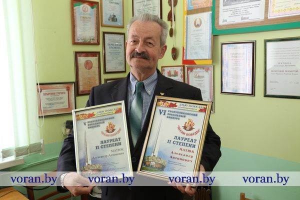 Каждые два года при поддержке Федерации профсоюзов Беларуси проводится республиканский вокальный конкурс среди ветеранов «Песни Победы». Таким образом исполнители со всех регионов Беларуси передают наследникам поколения победителей музыкальную эстафету памяти. В нынешнем мае творческое состязание прошло шестой раз. Заявки на участие подали 123 человека. По результатам отборочного тура жюри под председательством народного артиста Беларуси, композитора Леонида Захлевного выбрало и поощрило 15 лучших исполнителей. Среди них — концертмейстер Вороновской ДШИ, художественный руководитель народного ансамбля народной музыки «Лявоны» Александр Матюк, награжденный дипломом ІІ степени. На сцене он исполнил две авторские песни — «Ветераны» и «Берегите матерей». Жюри высоко оценило вокальное и исполнительское мастерство нашего земляка и в прошлый раз. Талантливый композитор и певец успешно дебютировал на конкурсе в 2017 году, став лауреатом ІІ степени.