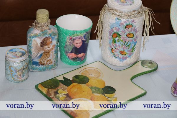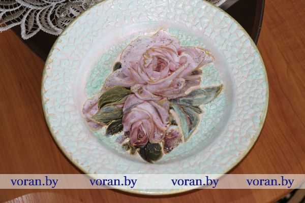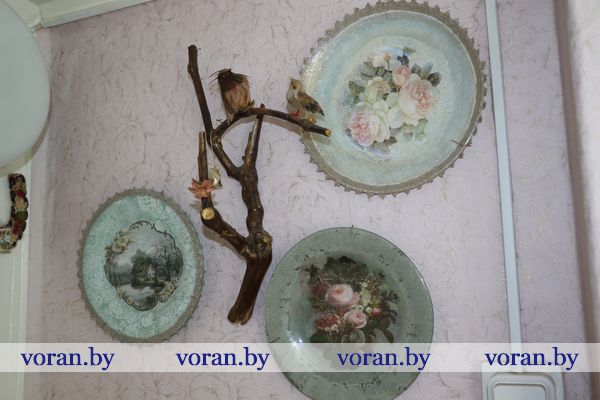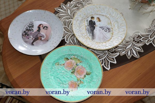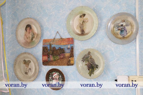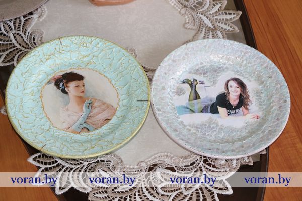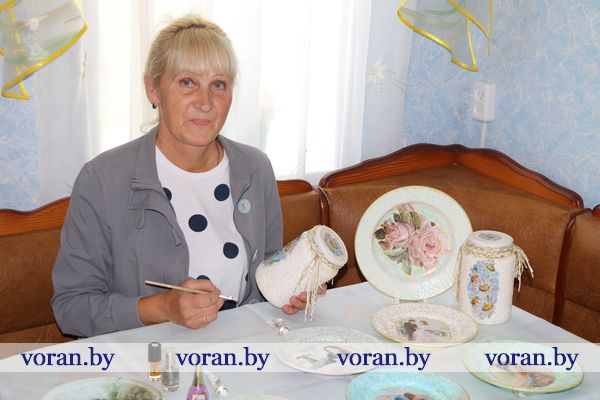Дочери обосновались с семьями в городах. Старшая Наталья — в Гродно, младшая Татьяна — в Минске. Свободного времени у Ирины Егоровны стало больше, а зимой так и вовсе нечем заняться энергичной женщине. Но и сидеть без дела не по ней. Ирина Егоровна нашла занятие по душе — самостоятельно освоила технику обратного декупажа. Суть ее в том, что изображение приклеивается на обратную сторону стеклянной посуды, оттеняется красками, а рисунок виден на лицевой стороне. Процесс кропотливый — один неправильный штрих может испортить все.