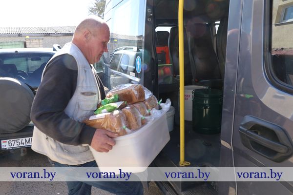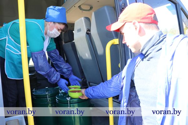 В назначенное время за комплексным обедом на ГАЗели приезжают водитель Валерий Юрго и раздатчица Светлана Глушкевич. Предварительно работники прошли учебу и аттестацию на знание необходимых санитарно-гигиенических норм, а транспорт — соответствующую экспертизу. С пылу, с жару все приготовленное на ресторанной кухне пересчитывается и затаривается для перевозки. Ежедневно заказывается по 50-60 порций. Передвижная «столовая» работает даже по выходным.