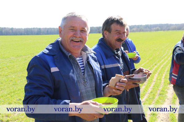 Первая остановка на длинном маршруте — в поле около д. Лошаки, где звено механизаторов и полеводов занято на внесении удобрений под озимый ячмень. Подоспевшие на обеденный перерыв труженики охотно поддержали кулинарную тему:
