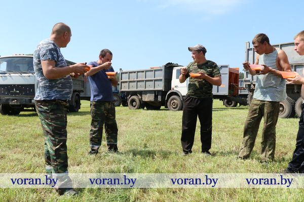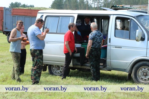 За все время нашего пребывания на поле сельчане не позволяли себе расслабляться, небольшой перерыв — только на обед. На этот раз работница столовой Тереса Вильчевская угощала кормозаготовителей гороховым супом, котлетами с макаронами и ароматным чаем.