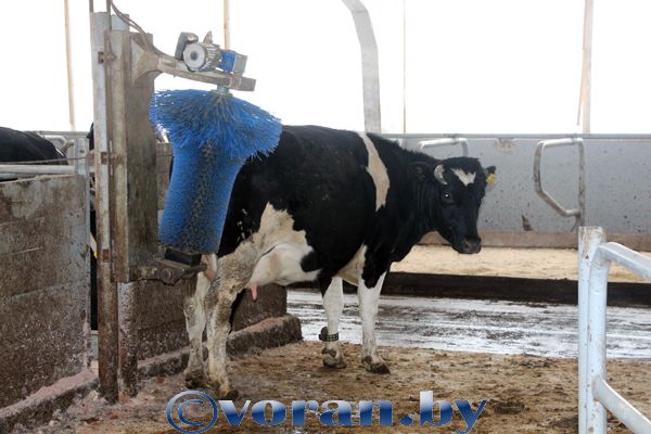 Т. Мушинский обсуждают технологию выращивания телок на МТФ «Солтанишки»; с помощью этого приспособления корма постоянно в зоне досягаемости животных; заместитель председателя по животноводству М. Воловицкий рассказывает коллегам о резервах продуктивности дойного стада на ферме «Лелянцы»; после кормового стола автоматическая щетка-чесалка для буренок самое приятное место.