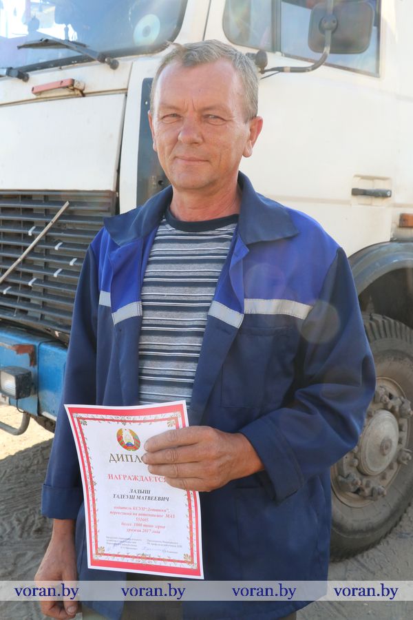 В районном соревновании среди водителей на отвозке зерна нового урожая первыми тысячниками стали водители Олег Крупович (фото 1) и Тадеуш Ладыш (фото 2) из КСУП «Дотишки». На утро 5 августа на счету Олега Марьяновича было 1 115 тонн перевезенного зерна. Не на много отстал от коллеги и Тадеуш Матвеевич — 1 004 тонны.