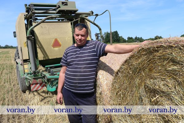 Если для комбайнеров уборочная кампания уже, считай, завершилась, то для механизатора сельхозпредприятия с 16-летним стажем работы Петра Юшкевича работы на полях еще хватает: надо убрать солому. На пресс-подборщике KRONE он запрессовал уже около 5 тысяч рулонов, каждый весом 300 килограммов.