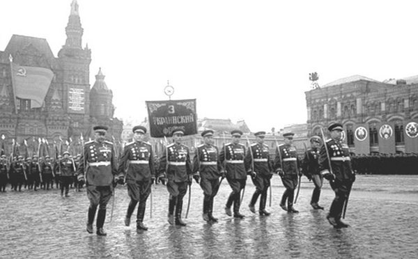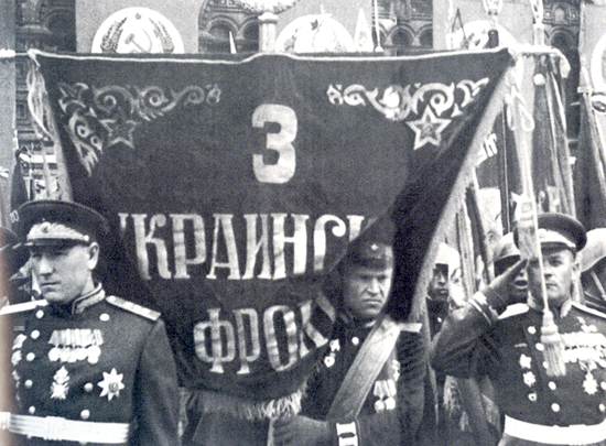 Герой Советского Союза Иван Данилович Лебедев на Параде Победы в Москве 24 июня 1945 года нес штандарт 3-го Украинского фронта