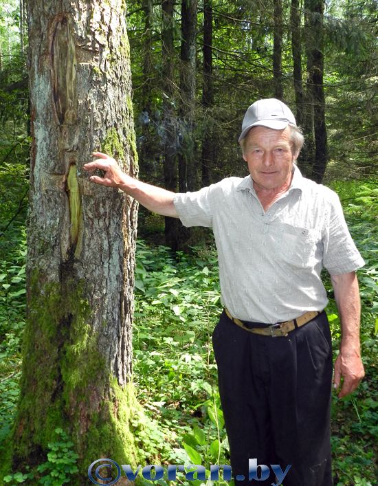 На снимке: И. Бальцевич показывает отметки на дереве, сделанные его отцом.