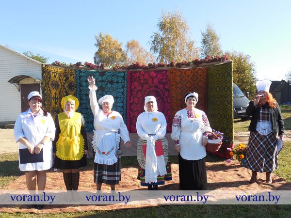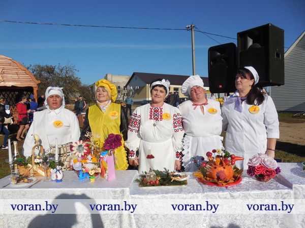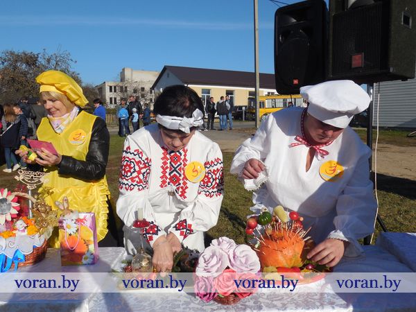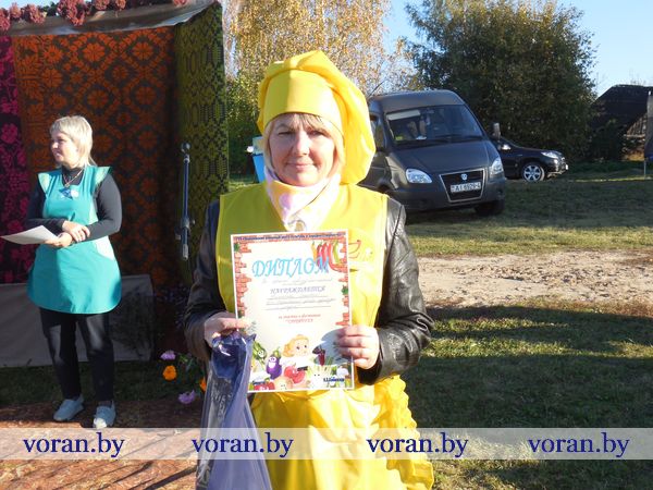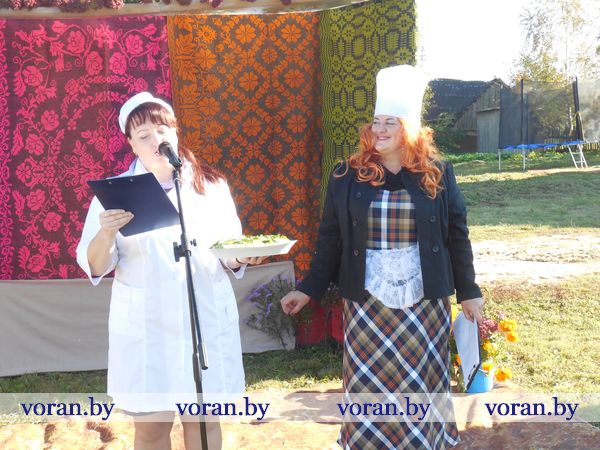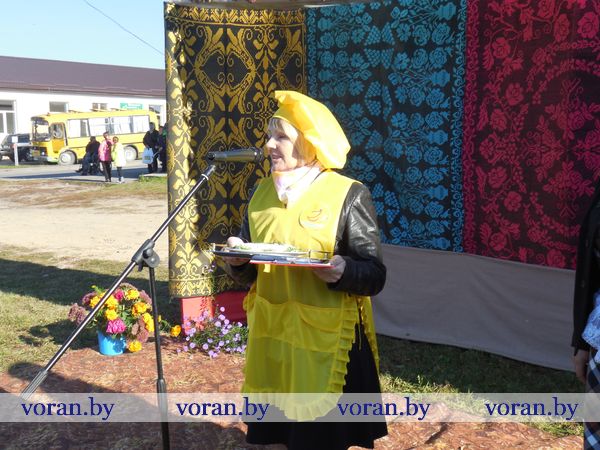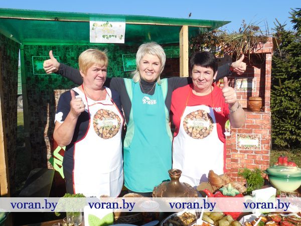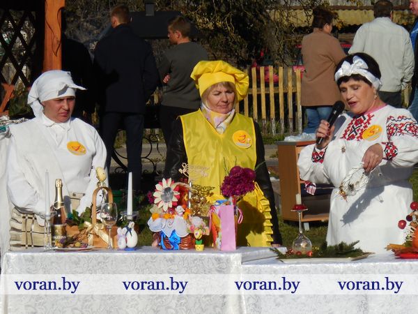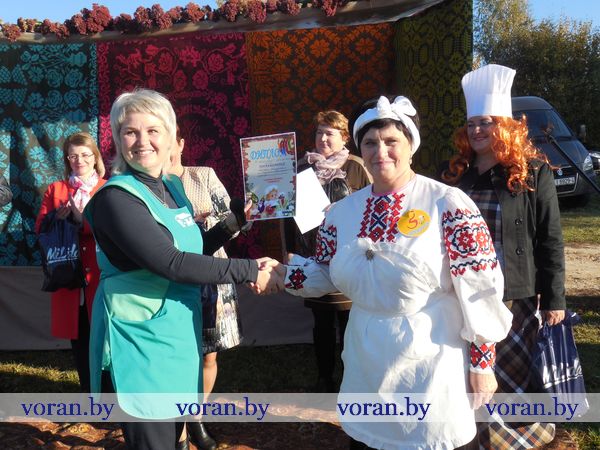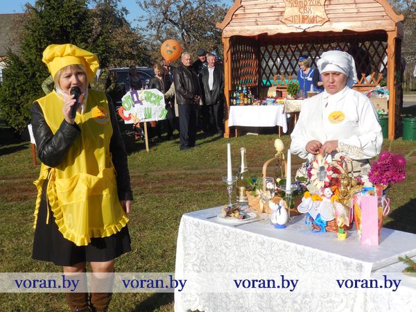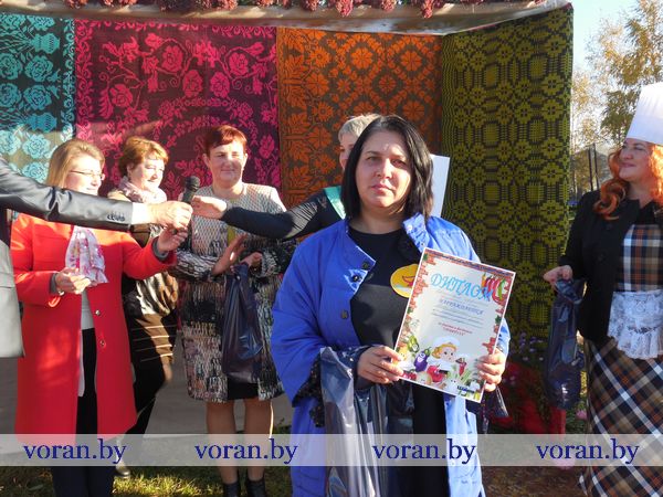 Тем временем за дело взялись настоящие кулинарные мастерицы: Оксана Козар из Дотишек, Валентина Янкович из Гирок, Людмила Лебедевич с помощницей Данутой Крень, Анна Неделько из Больтишек и Надежда Жегздрин из Радуни. Каждая из них стремилась завоевать сердца зрителей и удивить жюри. В конкурсе «Визитка» Оксана и Надежда показали себя как гостеприимные хозяйки – всех приглашали в свои открытые рестораны «Огонек» и «Чарка-шкварка». Анна и Валентина оказались творческими и увлекающимися людьми. Всех повеселил от души начский дуэт. На отлично все стряпухи приготовили осенние салаты. Любо-дорого было посмотреть и на их композиции. Можно было поучиться, как украсить стол на Пасху, Рождество, день рождения. Жюри оценило старания всех хозяек. Номинация «Праздничный костюм» уехала в Гирки, «Креативное украшение стола» - в Больтишки, «За электронный адрес» - в Радунь, «Музыкальная презентация» - в Дотишки. А бесспорным победителем стала Людмила из Начи. Кроме того, призы получили и местные хозяюшки, что испекли вкусные и красивые пироги, – из «Ё-моё», социальной службы, АВОП и школы. Вскоре все зрители угостились огромной пиццей, что с любовью для них приготовили землячки-повара.