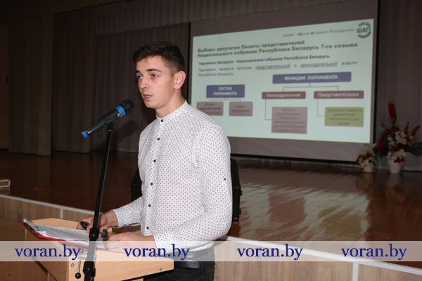 В начале необычного урока к ним обратился педагог-организатор Вороновской школы Эдуард Бутрим. Он рассказал о функциях и структуре Парламента, как проходят выборы депутатов в Палату представителей Национального собрания Республики Беларусь, о деятельности депутатов, а также познакомил школьников с молодежным парламентаризмом. Выступающего дополнила председатель районного Совета депутатов Елена Ганевич. Она нацелила юношей и девушек на активную взрослую жизнь: