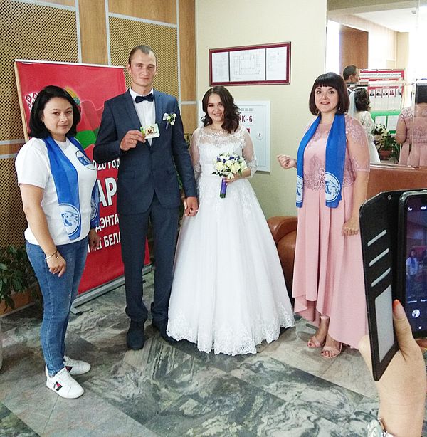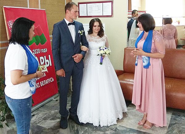 В преддверии важной политической кампании была инициирована акция "Всей семьей на выборы!" Активисты БСЖ встречали молодоженов на выходе из зала бракосочетания отдела ЗАГС Вороновского райисполкома. Они поздравляли супругов с новым статусом и напоминали о важности предстоящего выбора, который молодая семья должна сделать вместе со всей страной 9 августа.