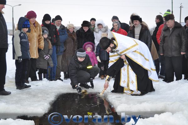 Мороз не остановил верующих совершить Крестный ход к крещенской купели, подготовленной на озере райцентра. В этот день праздничное омовение в проруби в виде креста совершили десятки вороновчан. Традиционно первыми в ледяной воде искупались местные моржи. Затем один за другим — эмоциональные смельчаки. Большинство в иордань окунались не в первый раз. Но были и новички, среди них даже маленькие дети.