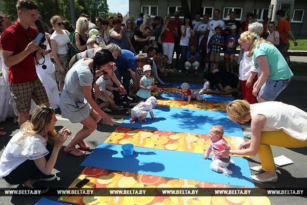 Украшением же мероприятия стал "турнир" между самыми маленькими участниками: два десятка детей в возрасте до 1 года выявляли того, кто ползает быстрее всех.