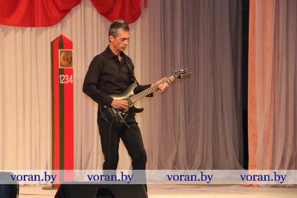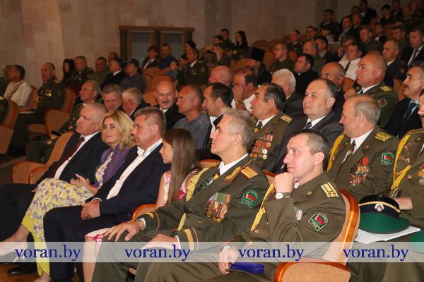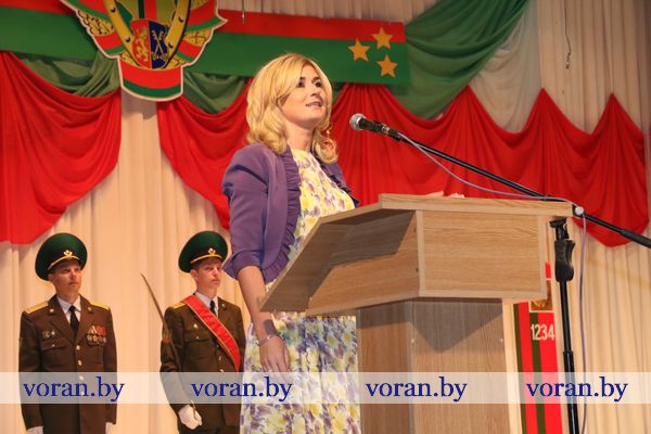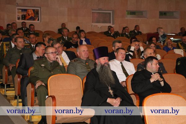 Со строгими рядами парадных кителей в зале прекрасно гармонировали яркие «гражданские» наряды жен и детей пограничников. Они с радостью разделили праздник со своими любимыми в выходной день. Трогательно и звонко звучали со сцены музыкальные поздравления от юных артистов — воспитанников подшефного детского сада №7 г. Лида, проникновенно и торжественно — от солистов военного оркестра Лидского пограничного отряда.