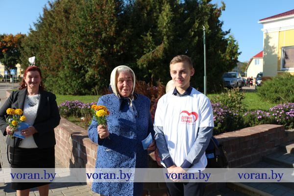 На улицах агрогородков и поселков людям старшего поколения дарили цветы школьники-волонтеры отряда «Доброе сердце» БРСМ. Традиционные встречи-чаепития «Золотая осень жизни» собрали пенсионеров-тружеников различных сфер в Вороново, Радуни, Заболоти, Беняконях. Слова признательности и благодарности звучали в адрес ветеранов войны и труда от представителей местной власти и общественных объединений. Музыкальные подарки дарили землякам творческие коллективы района.