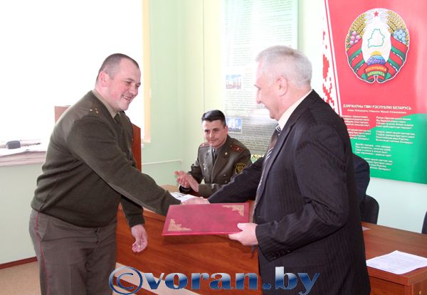Обо всем этом говорилось на торжественном собрании, которое собрало в здании Вороновского райвоенкомата не только работников, но и представителей местной власти. Теплые слова в адрес присутствующих высказал председатель районного Совета депутатов Святослав Конон. С приятной миссией на мероприятие прибыл заместитель председателя райисполкома Мечислав Уляшко, который вручил старшему лейтенанту Юрию Чеславовичу Балько, начальнику группы территориальной обороны Вороновского райвоенкомата, Благодарственное письмо председателя районного исполнительного комитета (на снимке). За достигнутые успехи в служебной деятельности и в связи с 95-летием со дня образования военных комиссариатов РБ благодарность А.В. Мантура, военного комиссара военного комиссариата Гродненской области объявлена капитану В.А. Бондареву, начальнику призыва на военную службу Вороновского РВК, К.А. Линго, главному специалисту группы призыва на военную службу. Грамотами награждены З.С. Пашкевич, начальник секретной части, и Я.В. Янковская, главный специалист мобилизационной группы. Благодарность военного комиссара Вороновского райвоенкомата Андрея Михайловича Волкова объявлена А.Ю. Гайжевскому, А.И. и М.М. Септилко, А.С. Васюкевичу, Б.В. Войтеховской, В.М. Смолину, М.И. Соболю, И.П. Точко, Л.Г. Яблонской, Т.В. Ковальчису, А.А. Оранскому.