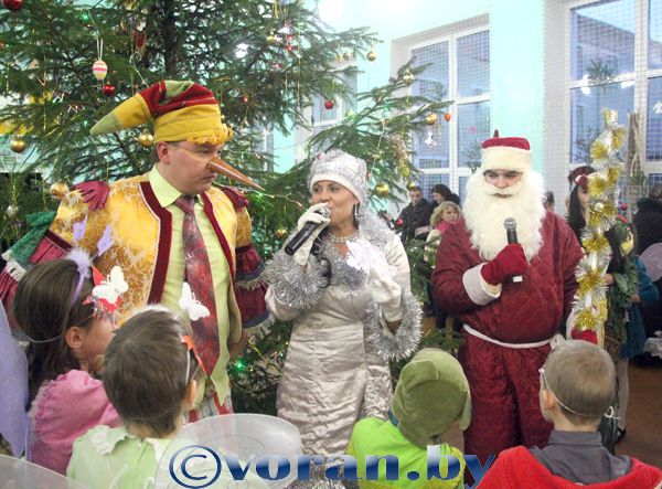 Праздник продолжили представители УВД Гродненского облисполкома. Они приготовили для ребят новогодний сюрприз — привезли в гости Деда Мороза, Снегурочку, Буратино и Бабу-Ягу. Эти персонажи продлили чудесную встречу детей со сказкой.