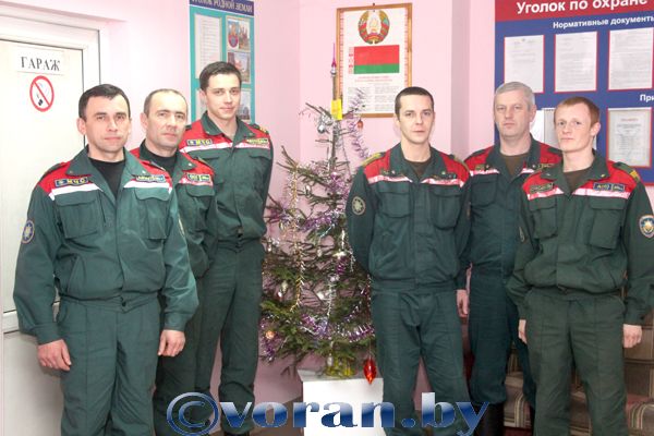 С первым визитом мы побывали в Вороновском районном отделе по чрезвычайным ситуациям. Там уже нес службу караул в составе начальника Анатолия Масюля, командира отделения Александра Кучинского, старшего пожарного Игоря Камыно, пожарного Валерия Бутрима, водителя Михаила Сарело и диспетчера ЦОУ Андрея Стакутя (на снимке).