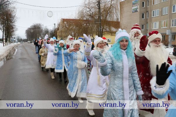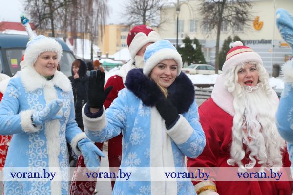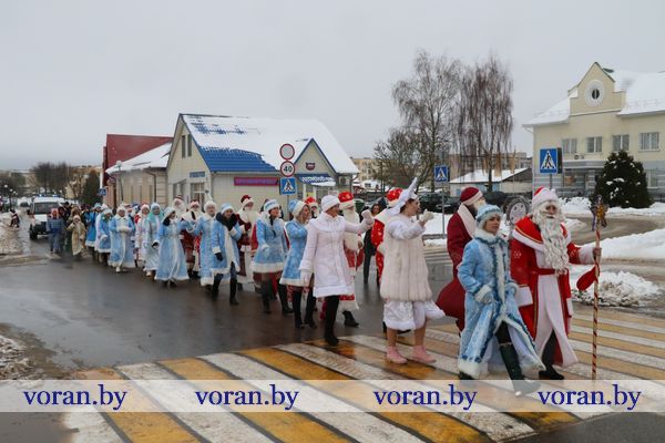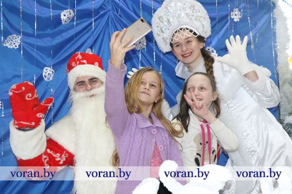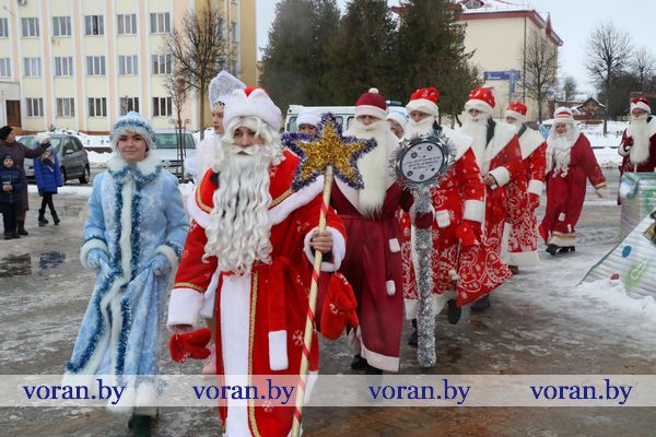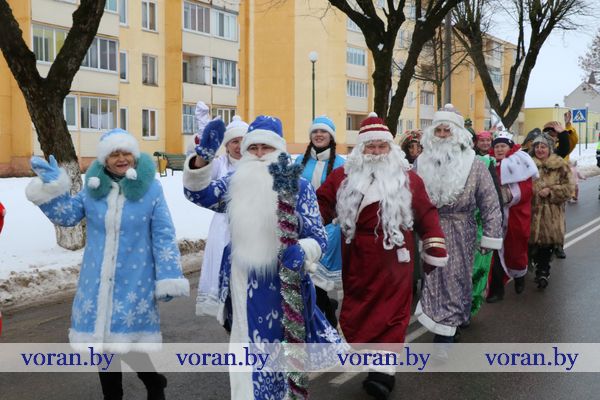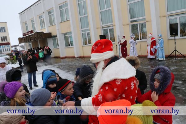 На площади в ожидании Дедов Морозов и Снегурочек с нетерпением толпилась детвора. Наверняка, рассуждали многие из них, дедушки с внучками припасли для детишек сладкие гостинцы. И ребята не разочаровались. Новогодние герои из колледжа, Вороновской ДШИ, Полецкишской школы и Бастунского УПК не только от души поздравили всех с приближающимся Новым годом, вручили гостинцы, но и пустились вместе с ребятами в пляс. Самыми позитивными, креативными и озорными оказались Снегурочка и Дедушка Мороз — Марта Макрицкая и Владислав Букляревич — из детской школы искусств. Они настолько пришлись по душе ребятам, что те их долго не отпускали. А как же без селфи на память?! Правда, фото из-за дождя делали уже в районном центре культуры и народного творчества.