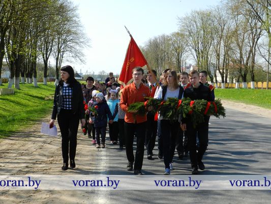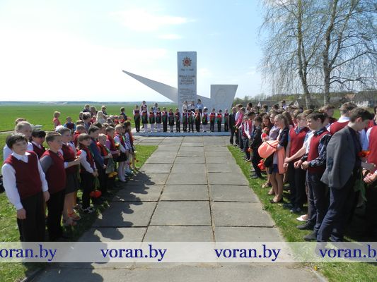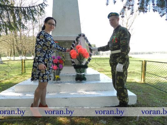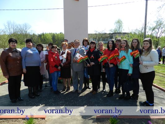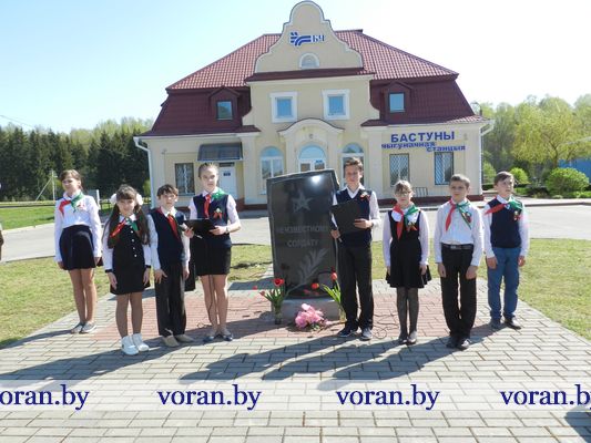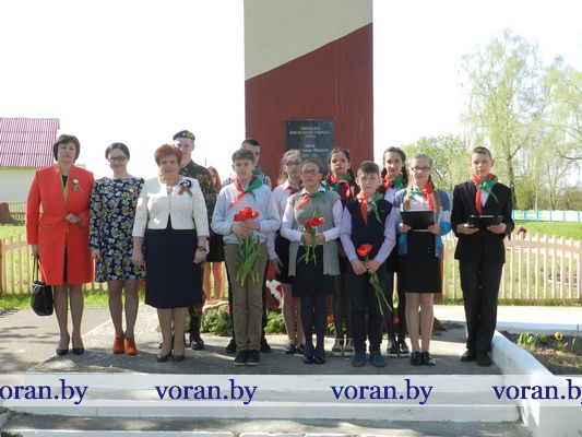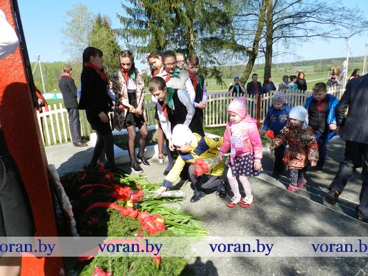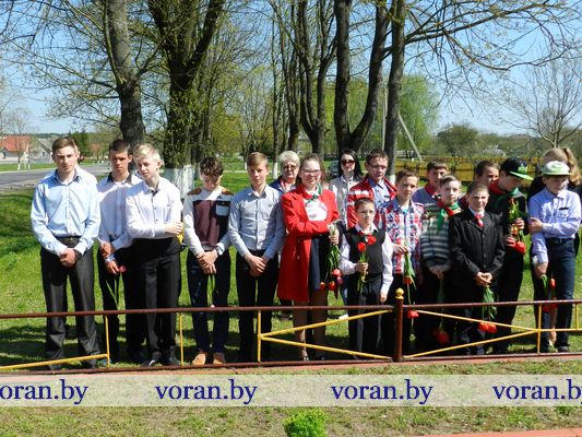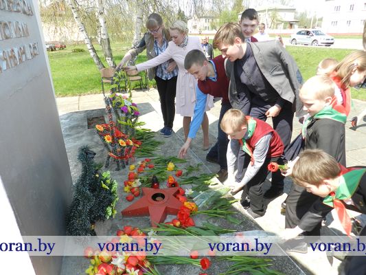 В Минуте молчания низко склоняли головы у могилы мирных граждан — жертв фашизма в Вороново, братских могил советских воинов в Трокелях и Бастунах, памятников советским активистам в Жирмунах и связисткам в Погородно. А у подножья их заалели тюльпаны. Вечная память героям Победы!