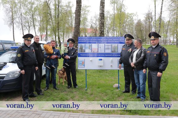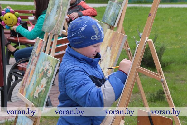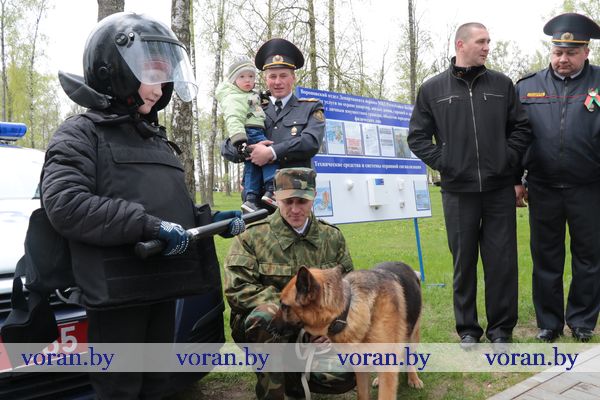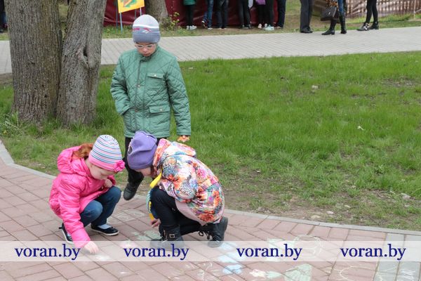 Пока взрослые ностальгировали, детвора дружно рисовала картинки о мире на асфальте и бумаге, играла в веселые игры на детских площадках и прыгала на батутах. Ребята не отходили от служебного автомобиля отдела Департамента охраны МВД РБ. Они с удовольствием примеряли бронежилеты, фотографировались со служебной собакой Салли, которая безупречно выполняла команды милиционеров.