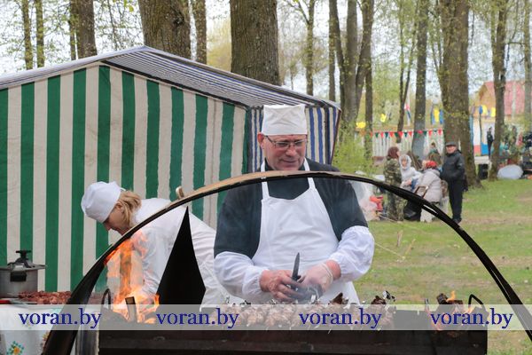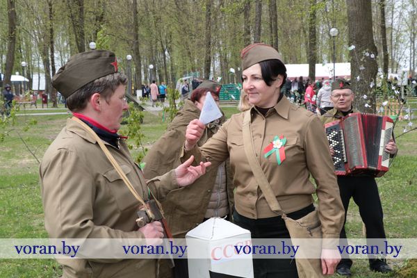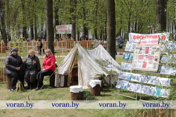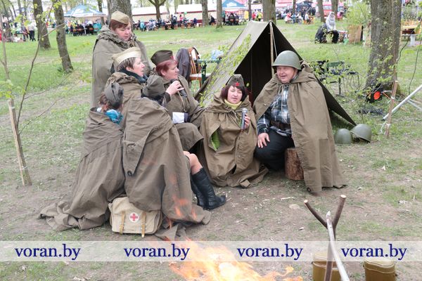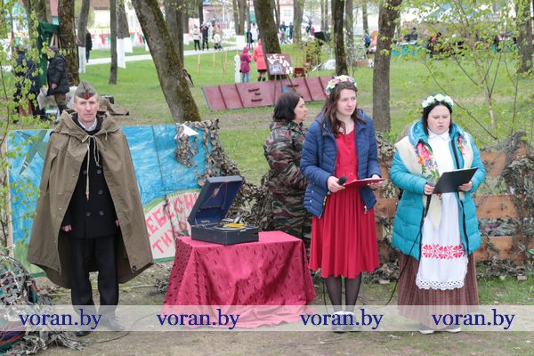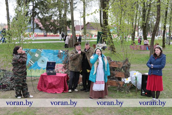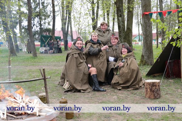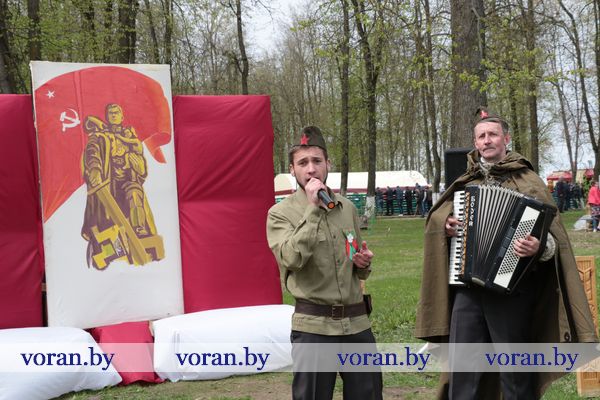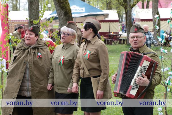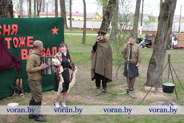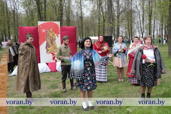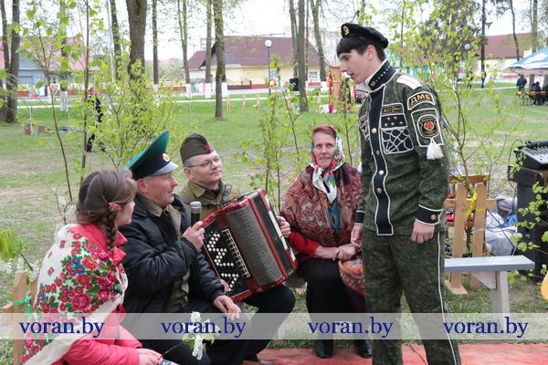Песни военных лет и победного мая звучали на тематических подворьях в парке. «Пограничники» из Трокелей и Переганцев надежно охраняли границу. Заболоть и Гирки «отправляли» на фронт смелого бойца. У импровизированной землянки горел огонь, у которого грелись беняконские и больтиникские «бойцы». Трогательные письма домой «отправляли» конвелишские и больтишские солдаты. «Первым делом самолеты, ну а девушки потом», утверждали погородненские и полецкишские «летчики». А потом всех дружно угощали солдатской кашей. О военной судьбе воинов внукам рассказывали на мисевичском и курчевском подворьях. Трогательную историю о матери, которая до сих пор ждет сына с войны, рассказали работники культуры Начи и Дотишек. С великим днем 9 Мая, что приближал весь советский народ, поздравляли Жирмуны и Бастуны.