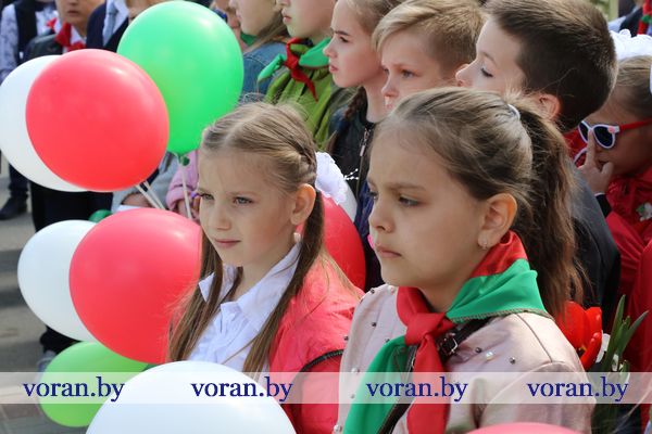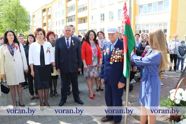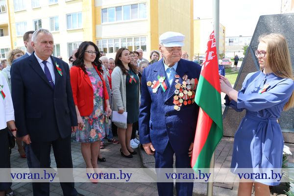 Под звуки гимна Государственный флаг подняли ветеран Великой Отечественной войны Степан Аксентьевич Жук и призер республиканского этапа олимпиады по трудовому обучению Виктория Маркевич из Вороновской школы.