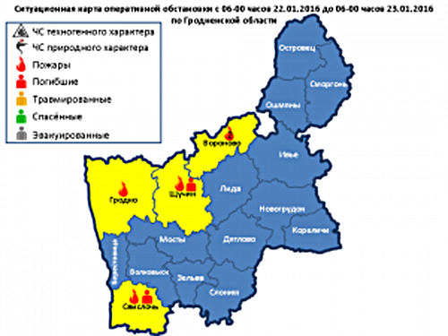 22.01.2016 г. в 07-18 поступило сообщение о пожаре хозяйственной постройки в д. Дайнова Вороновского района. В результате пожара уничтожена кровля, повреждены стены. Предполагаемая причина пожара – нарушение правил эксплуатации электросетей и электрооборудования (короткое замыкание электропроводки).http://mchs.gov.by/