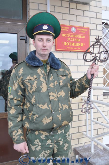 Возведение данного комплекса — это, конечно, большая заслуга строителей. Присутствующий на торжестве начальник строительного управления №118 Аркадий Бедный вручил символический ключ его хозяину — начальнику пограничной заставы «Дотишки», капитану Артуру Немеро (на снимке). По старой христианской традиции, новое здание было освящено настоятелем войскового храма в честь преподобного Сергия игумена Радонежского Лидского пограничного отряда отцом Алексеем. А ставшую уже символом открытия красную ленту перерезали А. Бедный, Н. Кукин и С. Конон (на снимке).