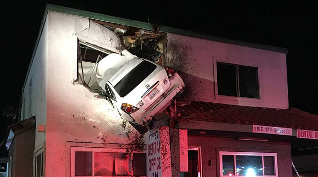 Автомобиль врезался во второй этаж небольшого офисного здания после того, как попал в центральный разделитель и взмыл в воздух.