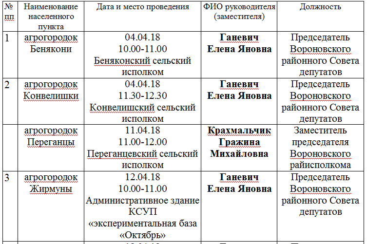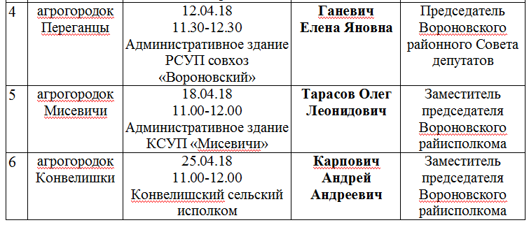 ГРАФИК встреч с населением по месту жительства председателем и заместителями председателя Вороновского районного исполнительного комитета, председателем Вороновского районного Совета депутатов в апреле 2018 года