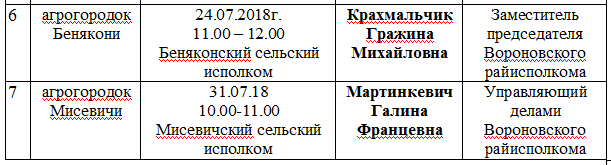 ГРАФИК встреч с населением по месту жительства председателем и заместителями председателя Вороновского районного исполнительного комитета, председателем Вороновского районного Совета депутатов в июле 2018 года