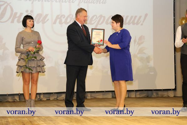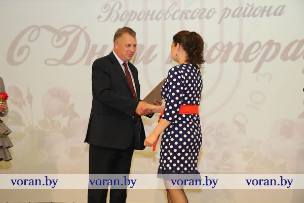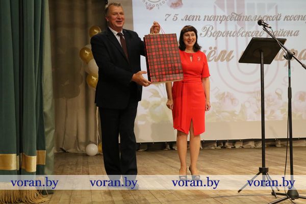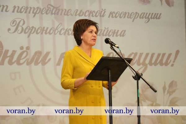 Очень теплым и жизнеутверждающим было поздравление председателя Вороновского райсовета депутатов Елены Ганевич. То, что не под силу решить одному человеку, легко разрешается совместными усилиями, заметила она. Именно эта идея побудила людей когда-то создать кооперацию. Пусть все отношения — и на работе, и вне ее — будут успешны, долговечны и, конечно, прибыльны. Благодарственным письмом райсовета награждены Светлана Коваленко, продавец автомагазина, Светлана Радевич, продавец магазина «Экспересс» г.п.Радунь, Татьяна Серафинко, оператор ЭВМ отдела промышленности. В череде добрых пожеланий не осталось незамеченным обращение к виновникам торжества заместителя председателя Вороновского райисполкома Галины Шарко. От лица главы района она объявила Благодарность продавцу минимаркета «Родны кут» аг. Бенякони Лилии Рудиковской, водителю Александру Войшнису, продавцу минимаркета «Родны кут» г.п.Радунь Валентине Кучинской, повару ресторана «Сустрэча» Татьяне Тубелевич.